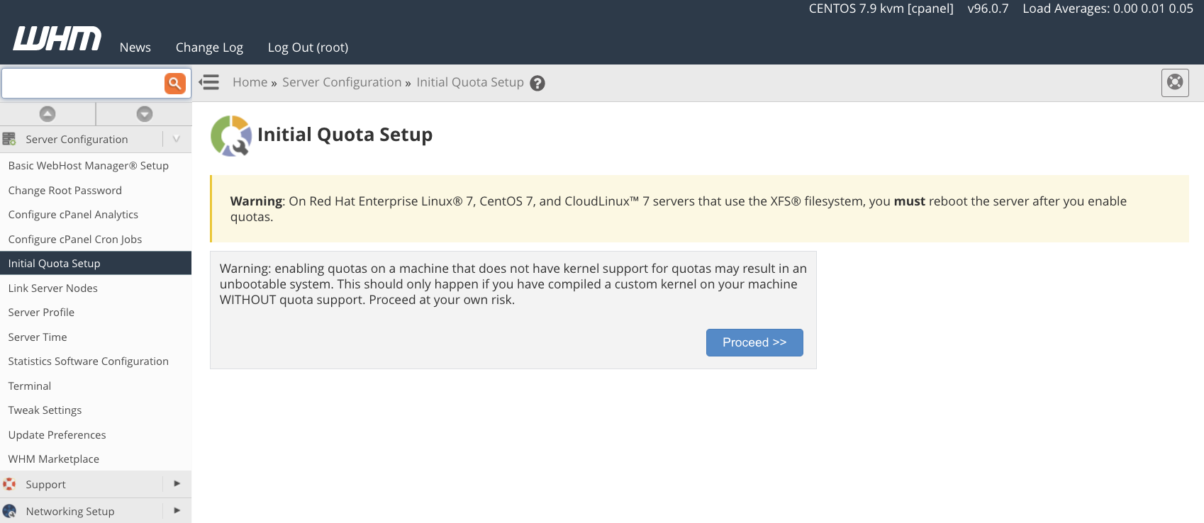 In WHM, navigate to Server Configuration -> Initial Quota Setup. Click the proceed button. Depending on the filesystem’s size, enabling quotas may take some time. Once they are enabled, you must reboot the server.