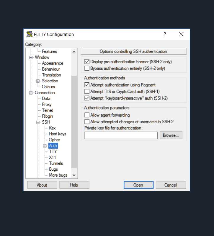 - In the left-hand sidebar, expand the Connection item, then the SSH item, and click Auth.