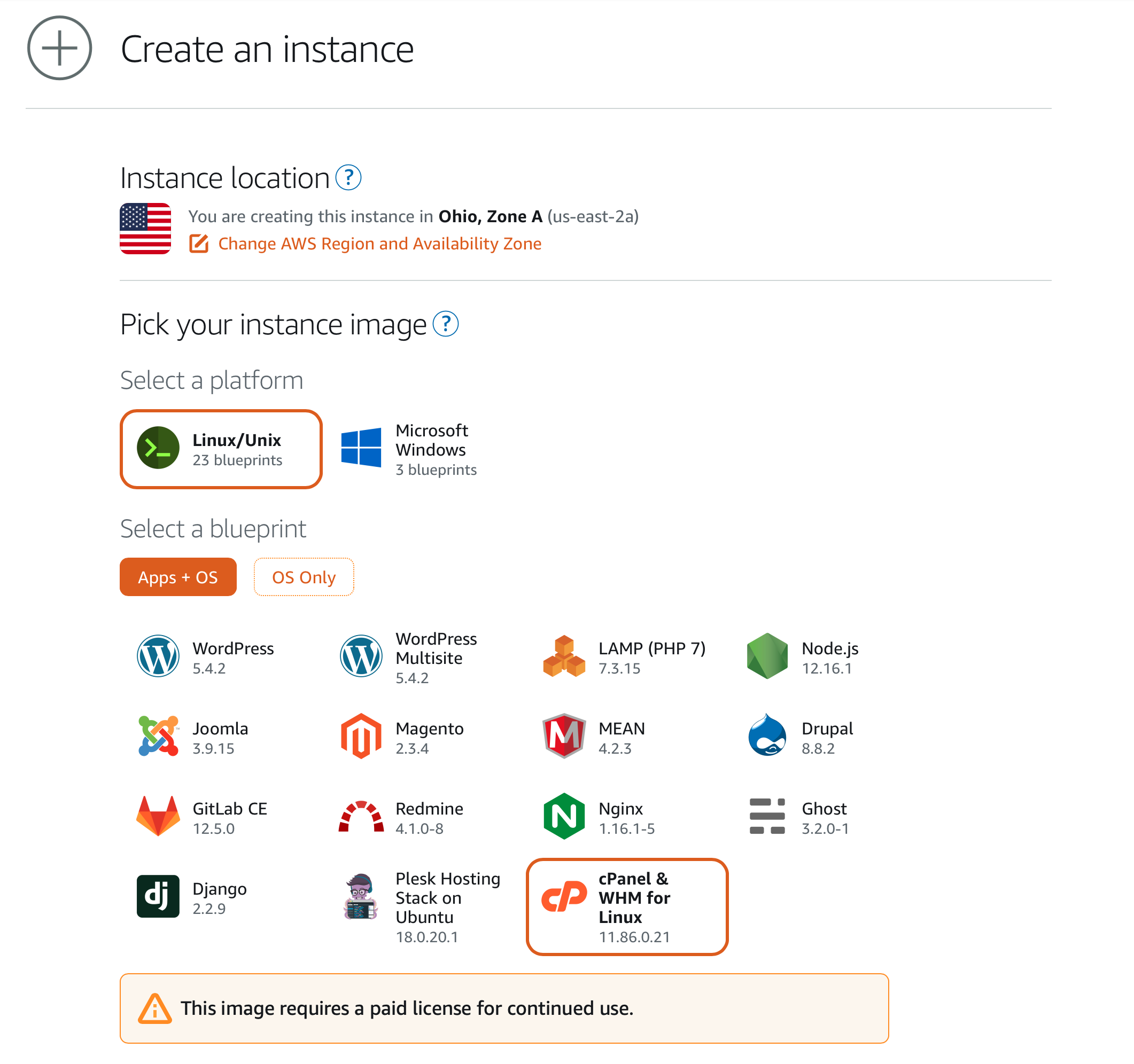 Next, we will create a new Lightsail instance. Click Create instance to get started. Choose the AWS Region and Availability Zone for your instance, then select the Linux/Unix Operating System (cPanel current only runs on the Linux Operating System). After selecting the OS, select the cPanel & WHM for Linux Blueprint.