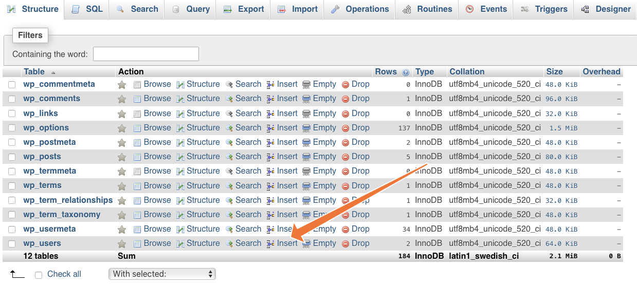 Next, we need to give the new user admin privileges. Go back to the main page for your database and click Insert next to the wp_usermeta table.