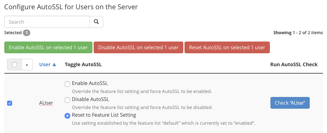 Here you can enable or disable AutoSSL for individual cPanel users, and reset to the default configured in the Feature List Settings. AutoSSL is turned on for all users by default, but you can change that in the Feature Manager, which you can find under Packages in the WHM sidebar menu.