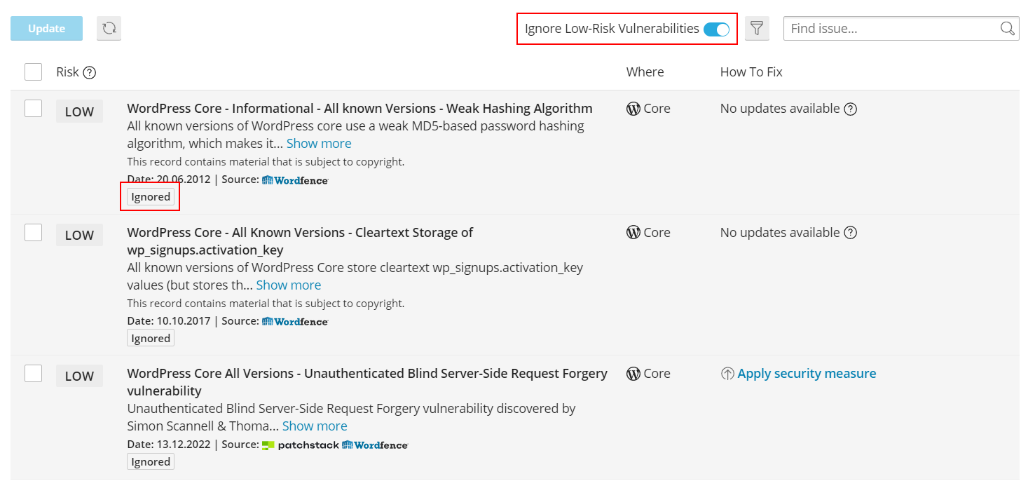 Our Risk rank does a much better job at reflecting the actual severity of WordPress vulnerabilities, so we’ve switched the filtering from CVSS to Risk rank. We have also enabled this filtering by default, meaning that all vulnerabilities with “low” risk rank will be hidden and ignored after the upgrade to WP Toolkit v6.4. This is how it looks now: