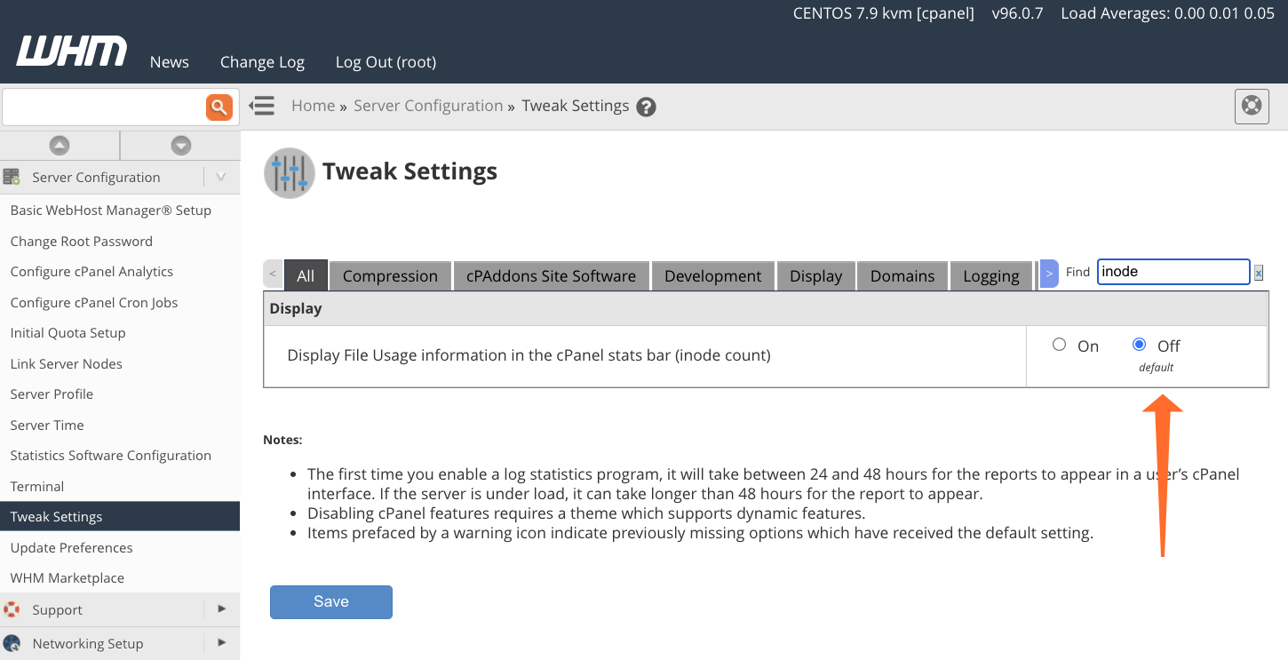 The File Usage feature isn’t displayed by default, but server administrators can activate it in WHM. Select Tweak Settings under Server Configuration in the WHM sidebar menu. Enter “inode” in the search box, and activate the Display File Usage information in the cPanel stats bar (inode count) tweak.