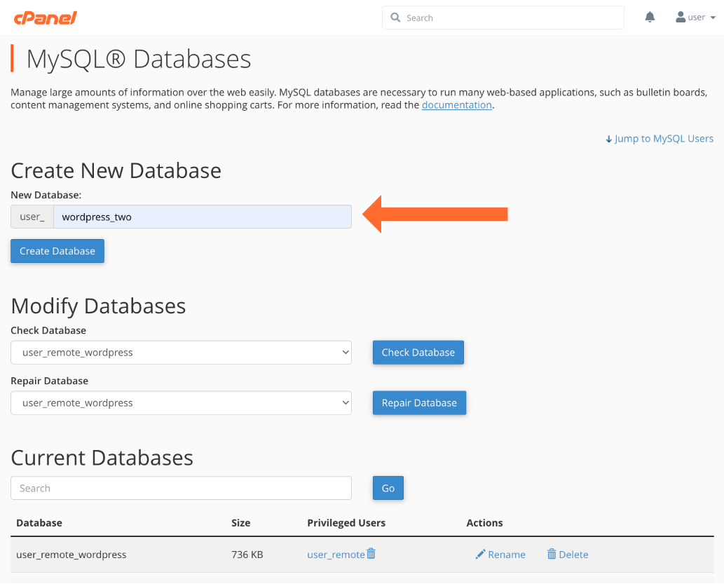 - Click Create User, and then return to the MySQL Databases page.