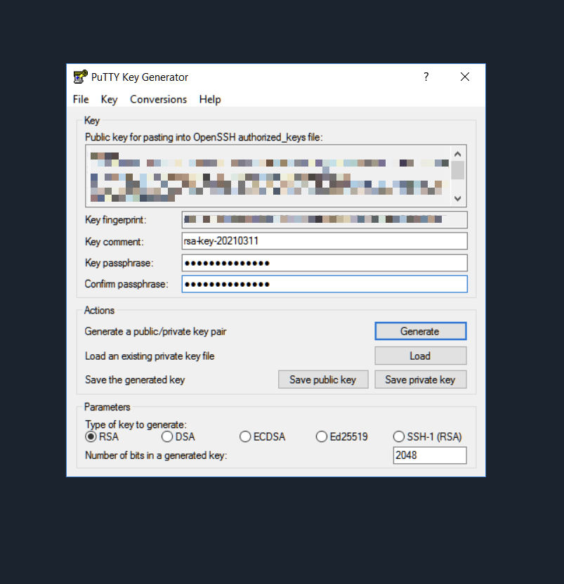 When you installed PuTTY, you also installed the PuTTY Key Generator. Launch it from the Windows menu. It’s another complicated-looking interface, but as before we’re only interested in a couple of the features.