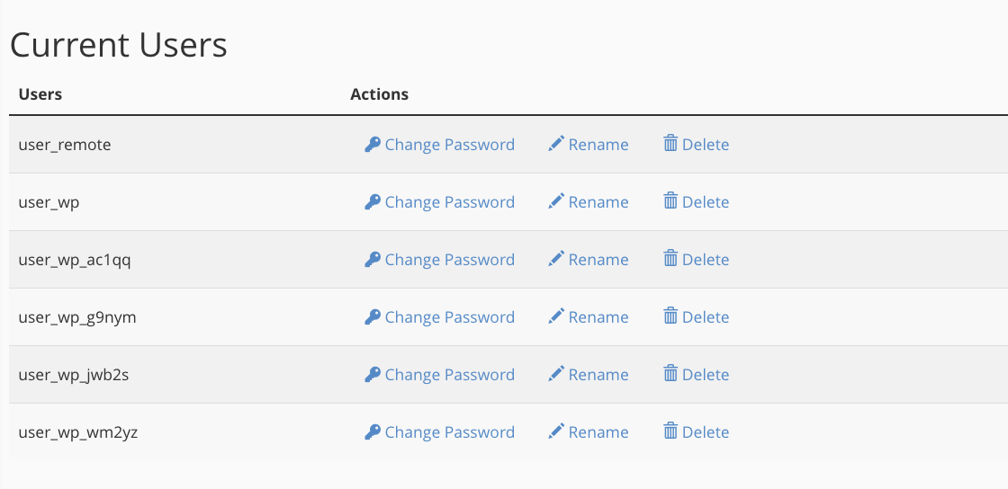 If you look at the images in the last section, you’ll see that many database users have a “wp” prefix. These are users cPanel created for WordPress-specific databases. WordPress hosts are often asked to change MySQL passwords when hosting clients lose them.