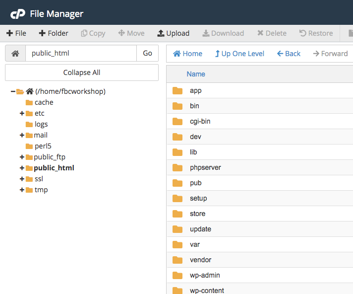 Once there, double click on “public_html” and then click on “Upload” from the top toolbar. Select the Magento 2.0 zip file you downloaded.
