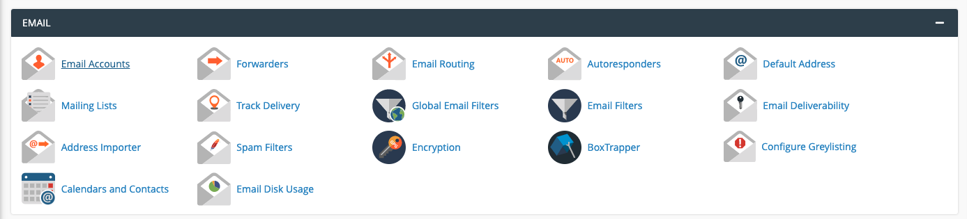 If you’re not already familiar, cPanel has a tool called Manage Email Accounts that gives users the ability to create email addresses for the domain they are hosting. Under the EMAIL header inside cPanel, there are several tools available for creating and managing your email accounts. Clicking on the “Email Accounts” icon will lead you to the section where you can manage existing or create new email accounts. To get started and create your email account, click on the +CREATE button.