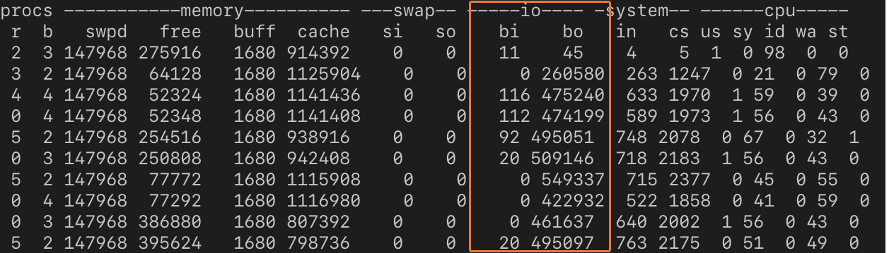 We’re asking vmstat to show us ten readings at one-second intervals. The first line shows average IO stats since the last reboot, and the subsequent lines show real-time statistics.