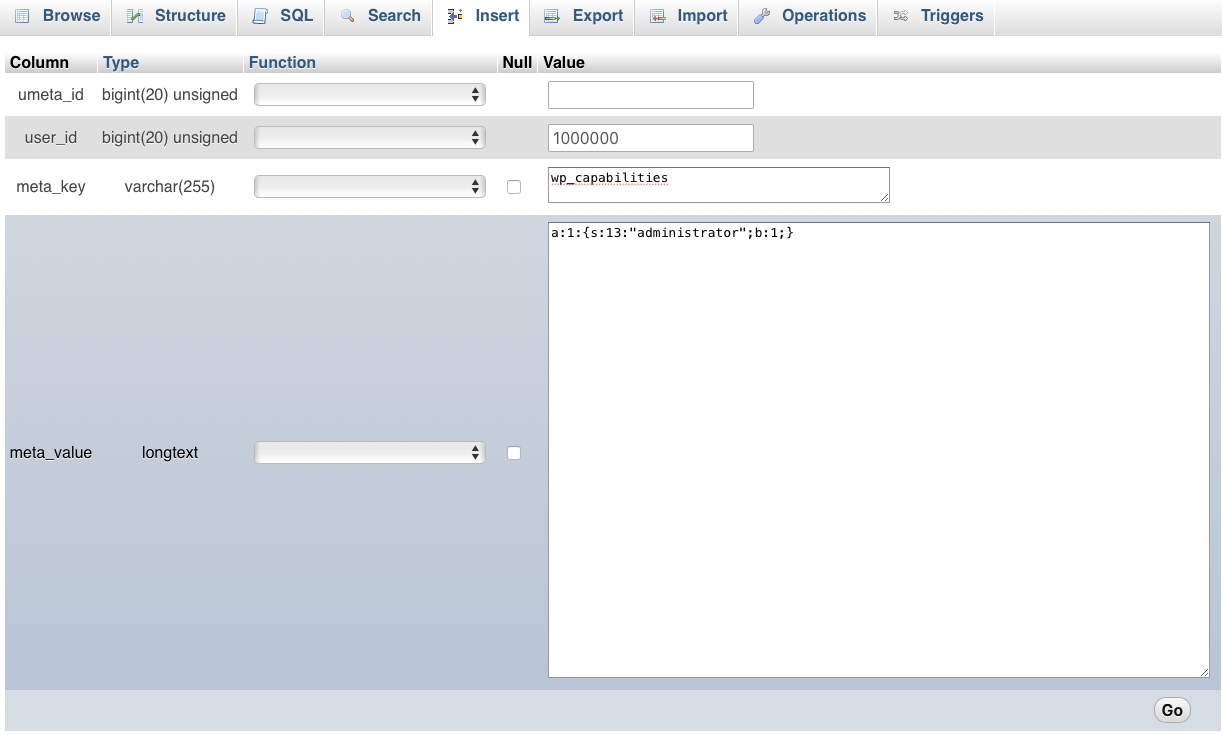 Next, we need to give the new user admin privileges. Go back to the main page for your database and click Insert next to the wp_usermeta table.