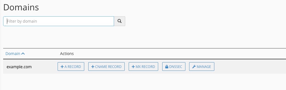In the Zone Editor, it is easy to add, remove, and edit records for domains hosted on the server. Find the zone you would like to change, and click on Manage.
