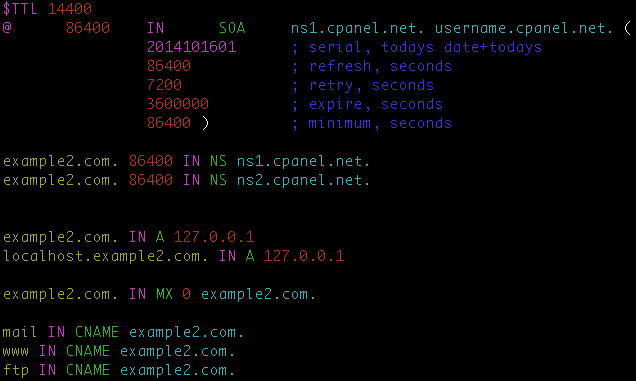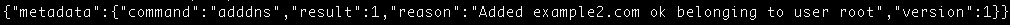Just as with the previous JSON results, seeing “1” in the output indicates that the action completed successfully. If you check your /var/named/ directory you should see the DNS zone file for example2.com.db which looks like this:
