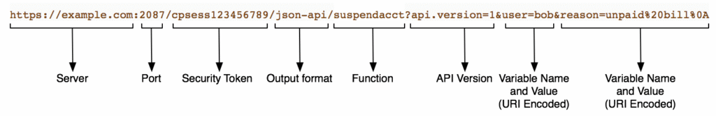 Here’s an image that shows the basic formatting of an API call – this looks a lot like the familiar WHM login of https://x.x.x.x:2087 but just includes extra data after the session ID.