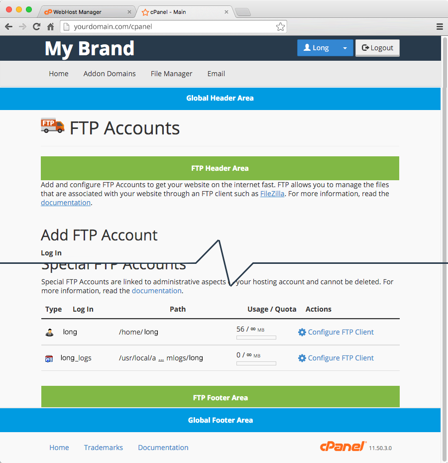 Go to your cPanel dashboard and refresh your browser. You’ll notice all pages have global content and FTP accounts page only include specific content for that page.