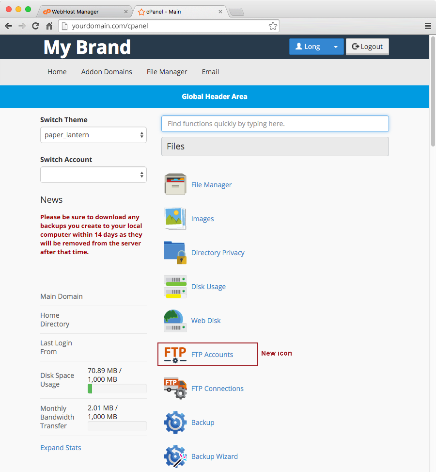 - Visit Paper Lantern’s appkey documentation and find the icon you wish to replace. In this case, the appkey for FTP accounts is ftp_accounts.png so your custom icons should be saved as ftp_accounts.png.