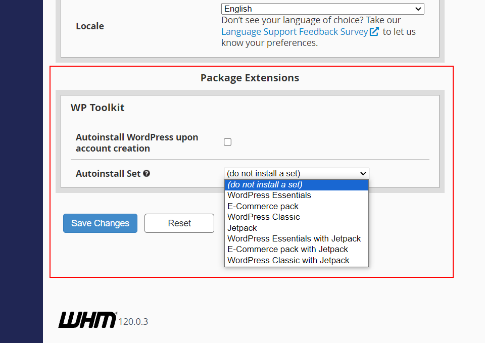 All cPanel packages now have a package extension with WP Toolkit option for preinstalling a WordPress site when the account with this package is created. Another option allows to choose which set should be automatically installed together with WordPress. This set will be installed every time a new WordPress site is installed under the corresponding account.