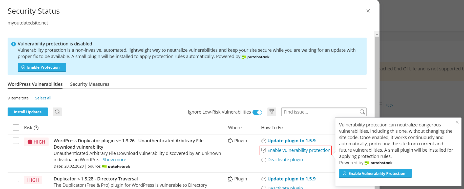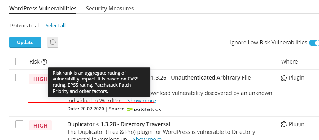 Our Risk rank does a much better job at reflecting the actual severity of WordPress vulnerabilities, so we’ve switched the filtering from CVSS to Risk rank. We have also enabled this filtering by default, meaning that all vulnerabilities with “low” risk rank will be hidden and ignored after the upgrade to WP Toolkit v6.4. This is how it looks now: