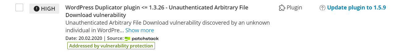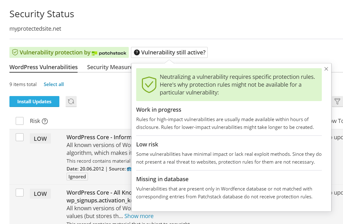 • Missing in database. Vulnerability protection is powered by technology provided by our security partners from Patchstack, so it works with vulnerabilities in Patchstack database. Vulnerabilities that are present only in Wordfence database or not matched with corresponding entries from Patchstack database do not receive protection rules. We’re working on matching all possible duplicates between two databases, but it will take us some time, since there are thousands of entries to be matched.
