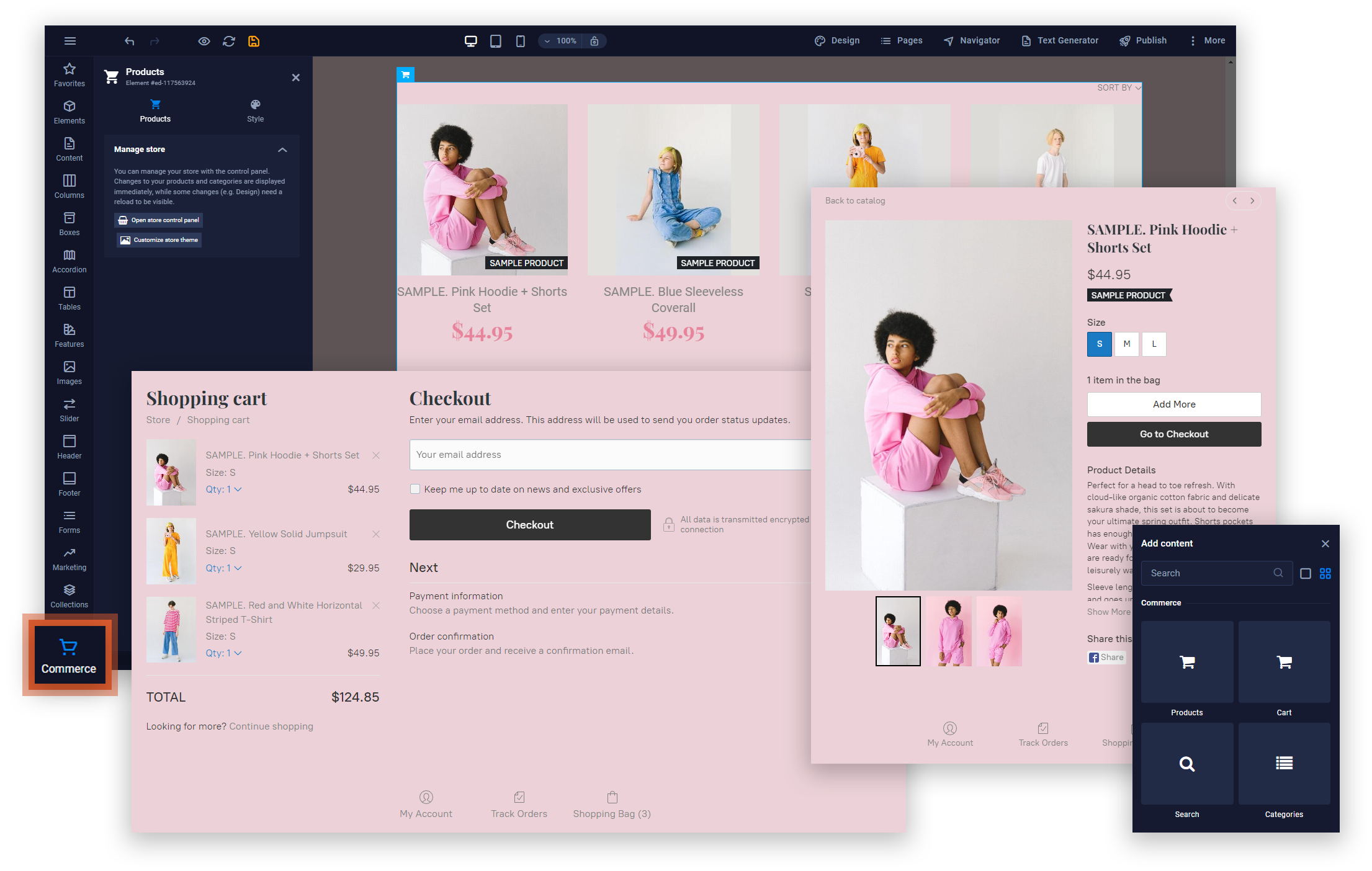 Sitejet Commerce is the latest addition to Sitejet Builder, designed to improve your website creation experience. But if you were missing a shop, fret not! Natively integrated, Sitejet Commerce provides centralized and hassle-free online selling. Customize your websites with creative freedom and eliminate limitations.